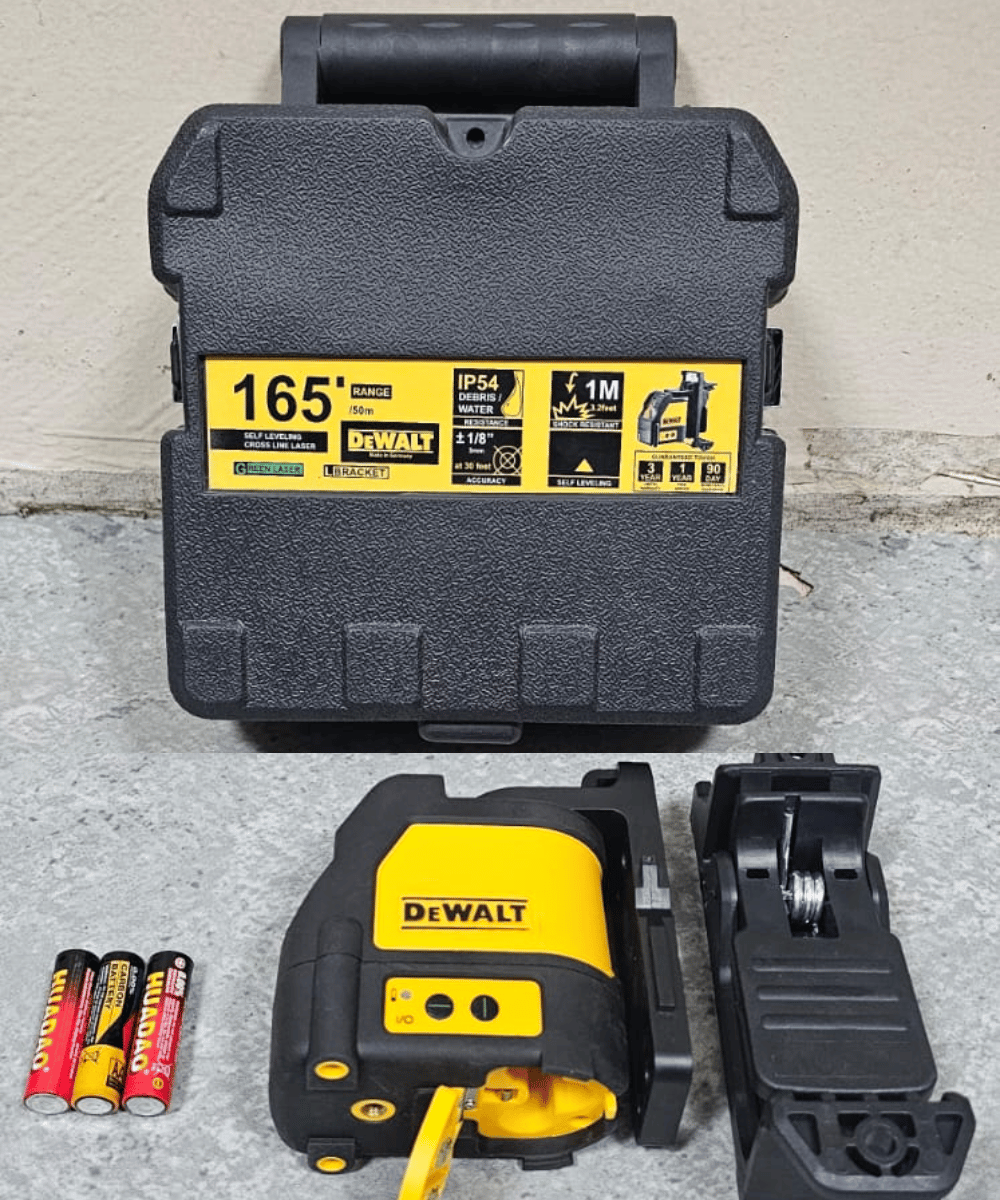تتضمن الحزمة ليزر دي والت رباعي الاتجاهات ذاتي التسوية بخط أخضر - مدى 25 مترًا مع 3 خلايا ومشبك ومدى 25 مترًا